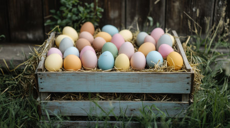 Rustic wooden crate filled with straw and pastel-colored Easter eggs outdoors