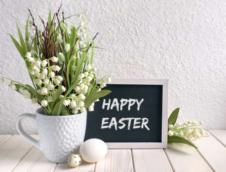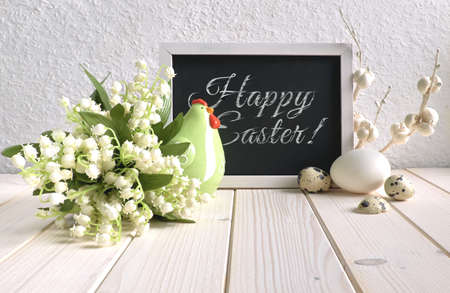 Easter composition with blackboard decorated with ceramic hen, eggs and and lily of the valley flowers, caption Happy Easter.