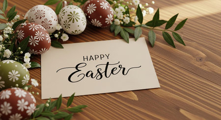 Happy Easter greeting card with easter eggs and flowers on wooden background