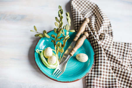 Stylish Easter table setting. Natural easter egg, pussy willow branches, feathers on modern plate with napkin and cutlery on white wooden table. Modern Easter table decoration
