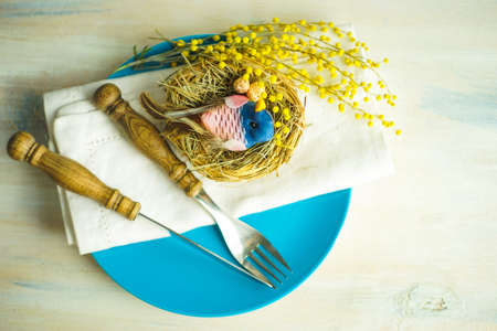 Easter table with cutlery on wooden table