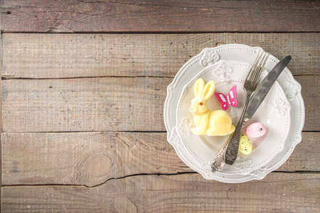 Easter table setting concept, flatlay composition with a space for text