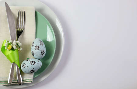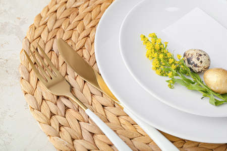 Festive table setting for Easter celebration on light background