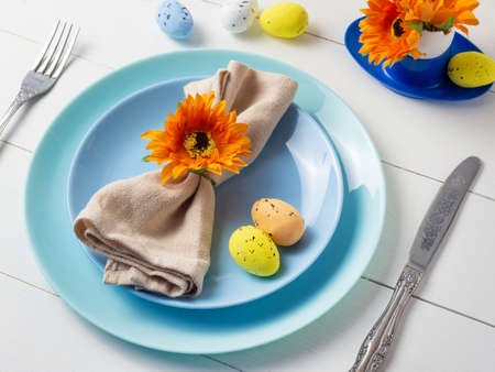 Festive table setting for Easter on a white table