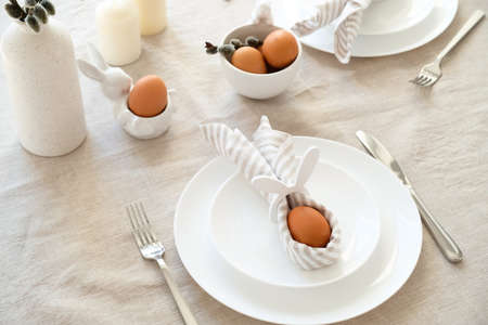 Rabbit Easter egg in napkin on plate. Easter dinner table setting concept.