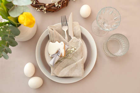 Easter table setting with cookie in shape of rabbit