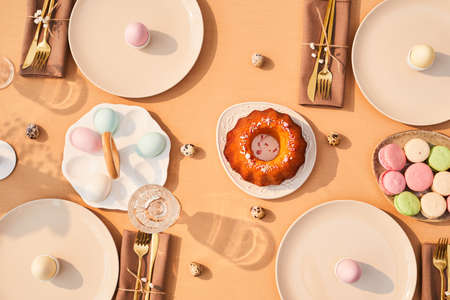 Top view background image of elegant dinner table decorated for Easter in sunlight, copy space