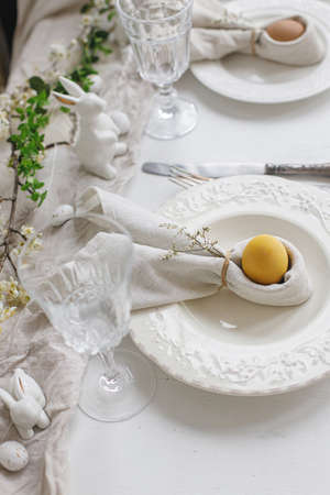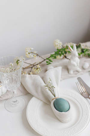 Easter egg in bunny napkin on plate with cutlery, bunny, spring flowers on rustic white table. Stylish elegant Easter brunch table setting. Modern table arrangement and eco decoration
