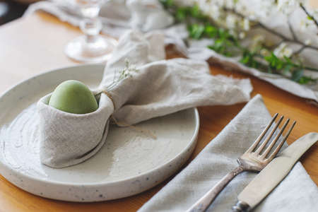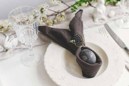 Stylish Easter brunch table setting with egg in easter bunny napkin. Modern natural dyed gray egg on napkin with bunny ears, flowers on vintage plate and cutlery. Easter table decorations