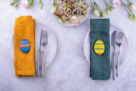 Easter table setting with cookie in shape of egg on light background