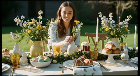 A festive Easter dinner table with people enjoying hot cross buns and flowers