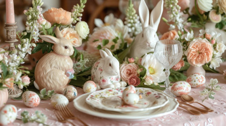 A festive table setting with a centerpiece of Easter-themed decor, including bunnies, eggs, and spring flowers.