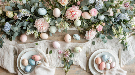 Elegant spring table setting with floral decor and decorative eggs. That the image is generated using AI.
