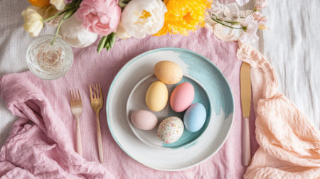 This beautiful Easter table setting features colorful eggs on a plate, fresh flowers, and elegant tableware, creating a warm and inviting atmosphere for spring celebrations.