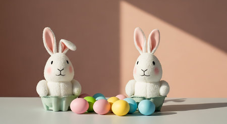 A white Easter bunny sitting next to a carton of colorful eggs on a beige background