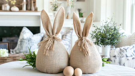 Rustic burlaps bunny with bow tie, set against a blurred floral background, symbolizing handmade crafts and spring decoration