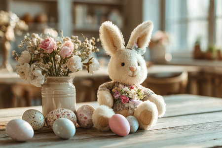 A soft bunny toy sits on a wooden table with colorful decorative eggs around it. A vase filled with flowers adds a charming touch to the cheerful spring atmosphere.