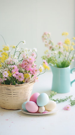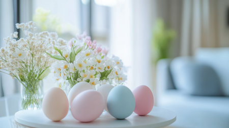 Beautiful arrangement of pastel colored Easter eggs beside fresh flowers in a bright, cozy interior space, perfect for spring celebrations and decorations.