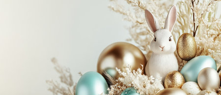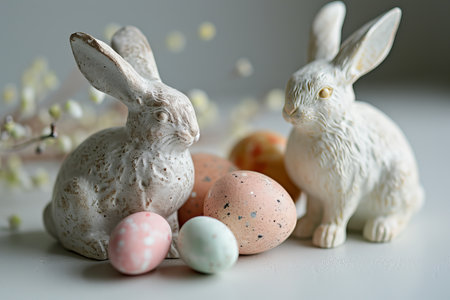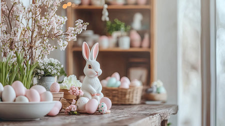 A charming Easter scene featuring a decorative bunny alongside pastel eggs and fresh flowers, perfect for capturing the essence of spring celebrations.