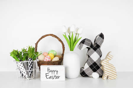 Happy Easter greeting with farmhouse style Easter decor and spring flowers on a white shelf against a white wall. Bunnies, basket of eggs, carrots and tulips.