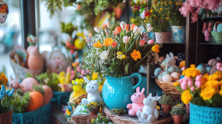 A vibrant display of spring flowers beautifully arranged in a blue vase. Decorative bunnies and colorful eggs enhance the festive atmosphere of Easter.