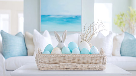 A delightful coastal style Easter arrangement features a basket filled with light blue eggs, a cheerful Easter bunny, and decorative seashells, creating a serene beach house ambiance.