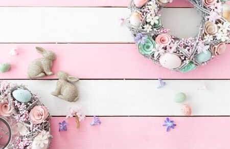 Easter holiday decoration background. High angle view