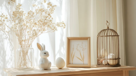 Aesthetic Easter home composition--mock-up frame, wooden cage, bunny figurine, and soft pastel elements arranged with elegance.