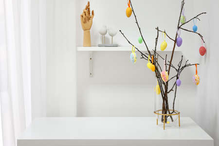 Vase with tree branches and different Easter eggs on table in light room