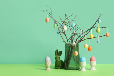 Composition with Easter eggs and green branches. Happy Easter.