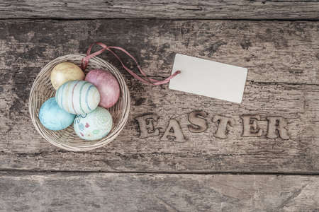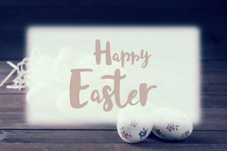 Happy easter painted eggs and lettering text, holiday background for your decoration. Retro film filter, vintage stylization