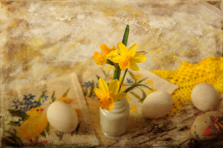 Closeup of small daffodils in white vase. Two white eggs on the table. Photo with digital texture layers.