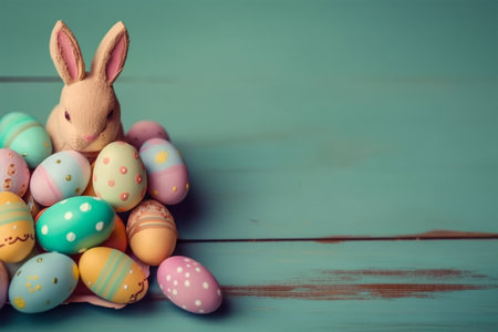 Happy Easter Day background and backdrop, cute bunny rabbit, ornament, and colorful egg, copy space greeting and backdrop, banner, rustic vintage design material. Celebrate Easter.