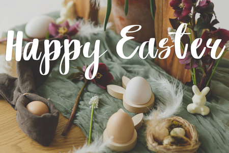 Happy Easter text sign on wooden bunny ears and easter natural eggs, spring flowers, feathers on rustic table. Modern Easter greeting card. Handwritten lettering