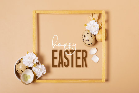 Frame with Happy Easter text and eggs composition decorated with twigs and flowers. easter greeting card.