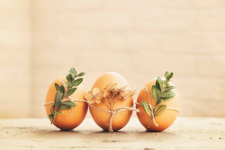 Natural eggs with bunch plant and dried flowers on netrual background in sunny day. Eco-friendly Easter concept.