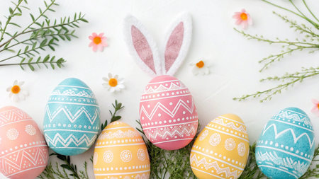 Top-down view showcases a collection of Easter eggs, decorated with delicate floral and polka dot patterns using watercolor techniques.
