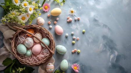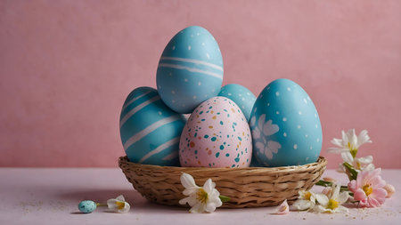 Beautifully painted pastel Easter eggs nestled in a charming woven basket, adorned with delicate spring flowers. A festive and cheerful spring scene.