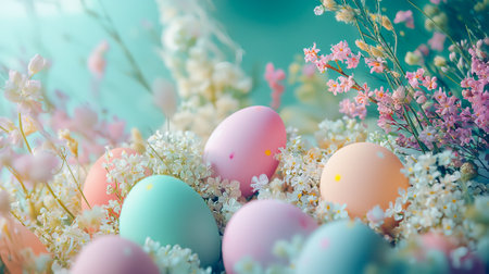Pastel Easter Eggs Nestled Among Delicate Spring Flowers. Concept of Easter Celebration, Spring Renewal, Festive Atmosphere. Copy space.