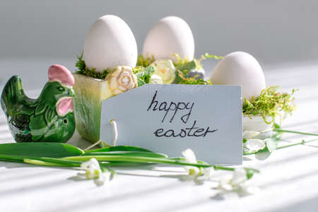 Flat lay non focus easter background with bouquet white flwoer and easter eggs in soft color on white background decorate and wooden black text , happy and funny season in april