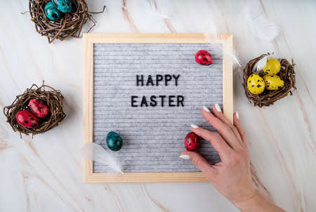 Easter holiday concept. Woman hand putting a colored quail egg on the felt letter board with the words Happy Easter top view flat lay