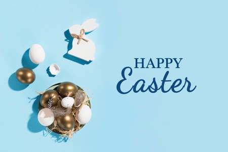Festive Easter holiday greeting card background. Easter white golden eggs, quail eggs and feathers on blue table. Copy space, top view. Minimal easter card concept, hard shadows.