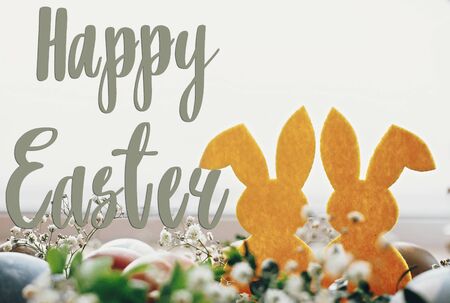 Happy Easter text. Easter greetings card. Stylish easter eggs, yellow bunny in nest of spring flowers on rustic table. Natural dyed easter eggs and rabbit. Holiday card