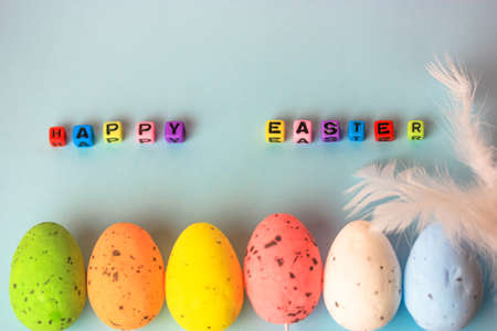 Multicolored Easter decorative eggs and white feather on a gently blue background. Happy Easter inscription made of multicolored beads. Minimalistic background. Space for text.