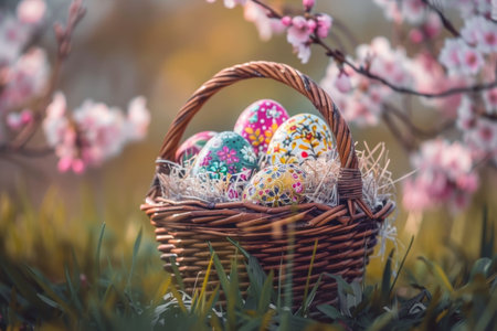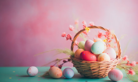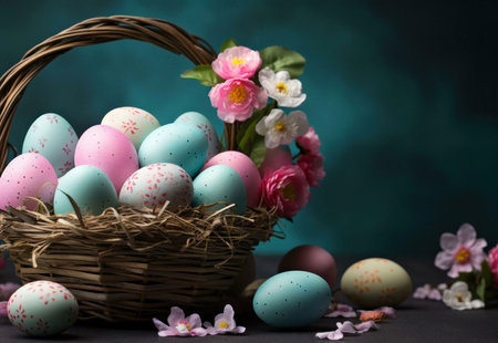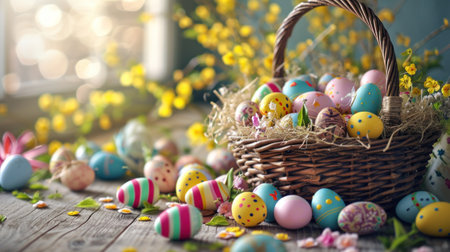 A decorative basket overflowing with colorful Easter eggs, painted with delicate patterns, surrounded by cheerful spring flowers. The basket is made of woven material and has a rustic charm.