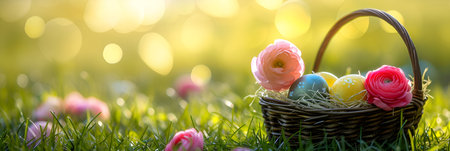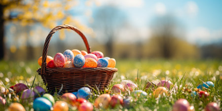 Multi-colored eggs in a wicker basket on a green meadow in the sun. Easter banner.