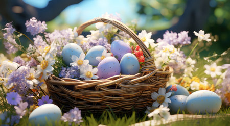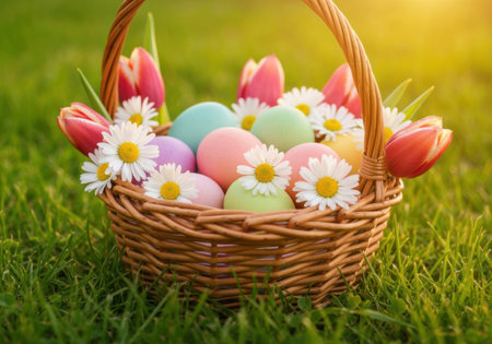 Colorful pastel eggs and spring flowers in a woven basket on green grass during a sunny morning, celebrating festive easter traditions.