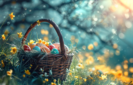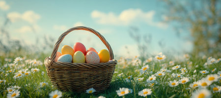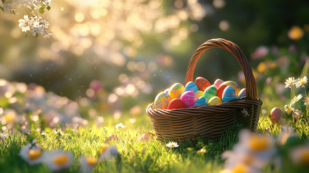A woven basket filled with colorful Easter eggs sits on a grassy field dotted with white flowers. The sun shines brightly, creating a cheerful spring atmosphere.