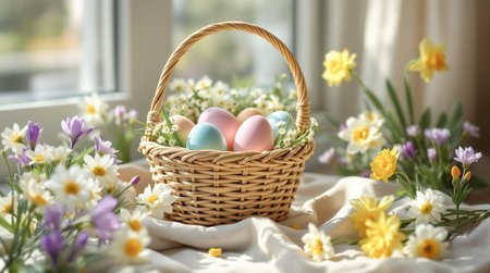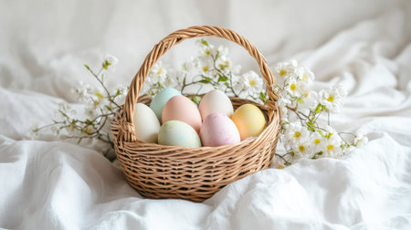 A beautiful woven Easter basket filled with pastel-colored eggs, surrounded by soft spring flowers, placed on a soft cloth with open space for creative text or designs