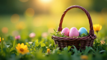 A wicker basket filled with pastel Easter eggs and spring flowers sits in a sunny meadow.
